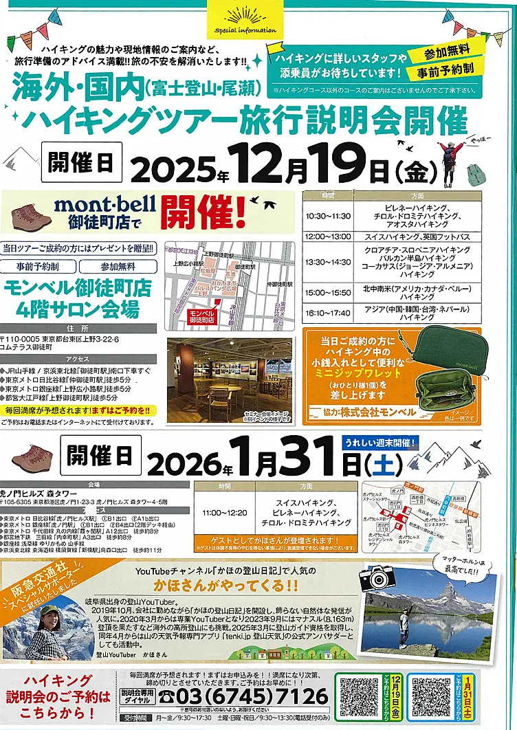 海外ハイキングの魅力や現地情報のご案内など、旅行準備のアドバイス満載! 旅の不安を解消いたします。当日は、ハイキングに詳しいスタッフや添乗員がお待ちしております。