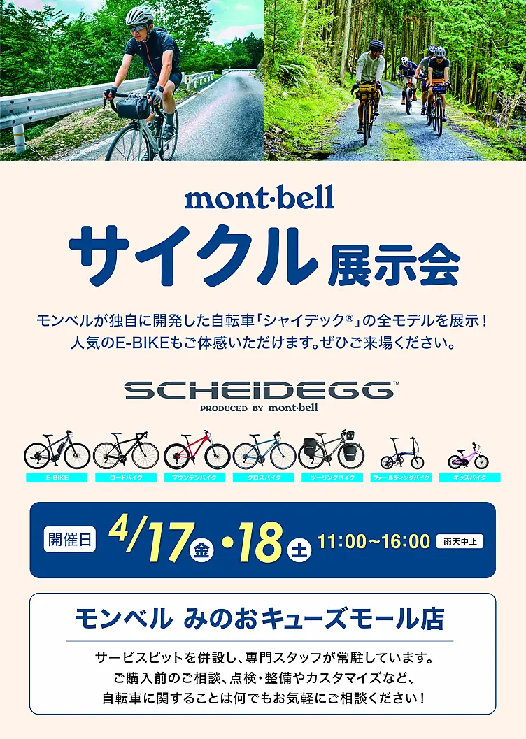 箕面萱野駅直結のみのおキューズモール内「Qsステージ」にて、モンベルのオリジナルブランド「シャイデック®」シリーズのスポーツバイクを多数展示します。