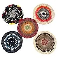 靴下を製造すると必ず出る端切れを「指編み」という技法で編んだマットです。生地は靴下の産地、奈良県広陵町の物を使用しています。椅子の上や玄関にはもちろん、観葉植物の鉢の下に敷いてもかわいいです。
